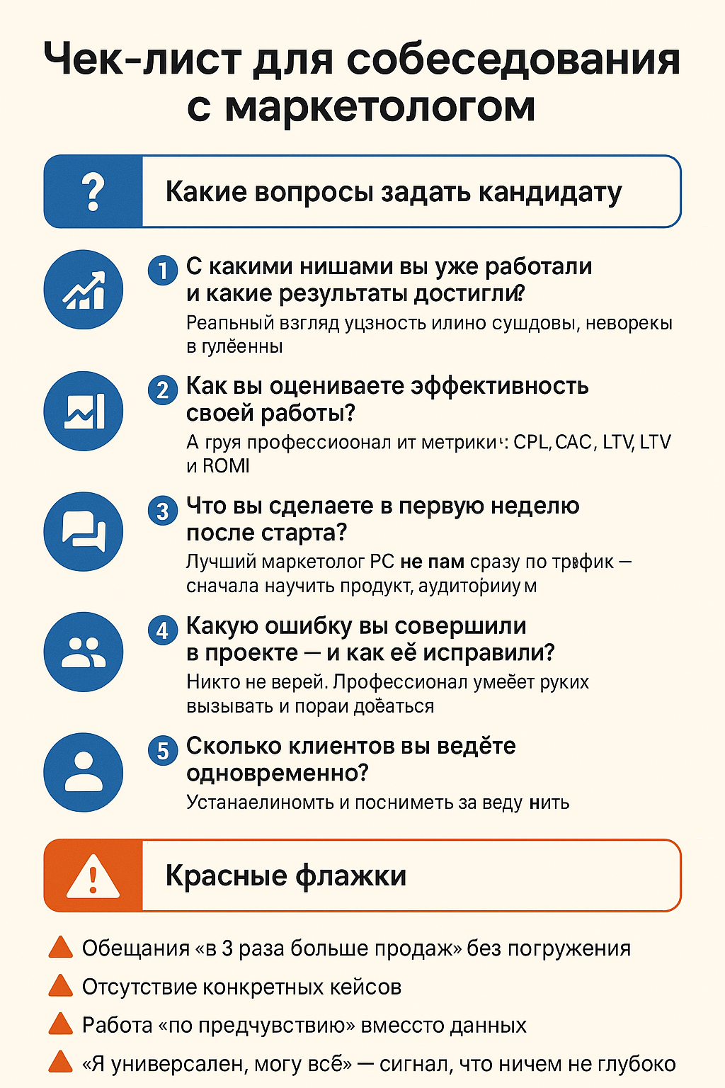 Когда ты приглашаешь маркетолога на встречу или созвон, у тебя уже есть цель — проверить не только его харизму, но и глубину. Этот чек-лист поможет не упустить важное: