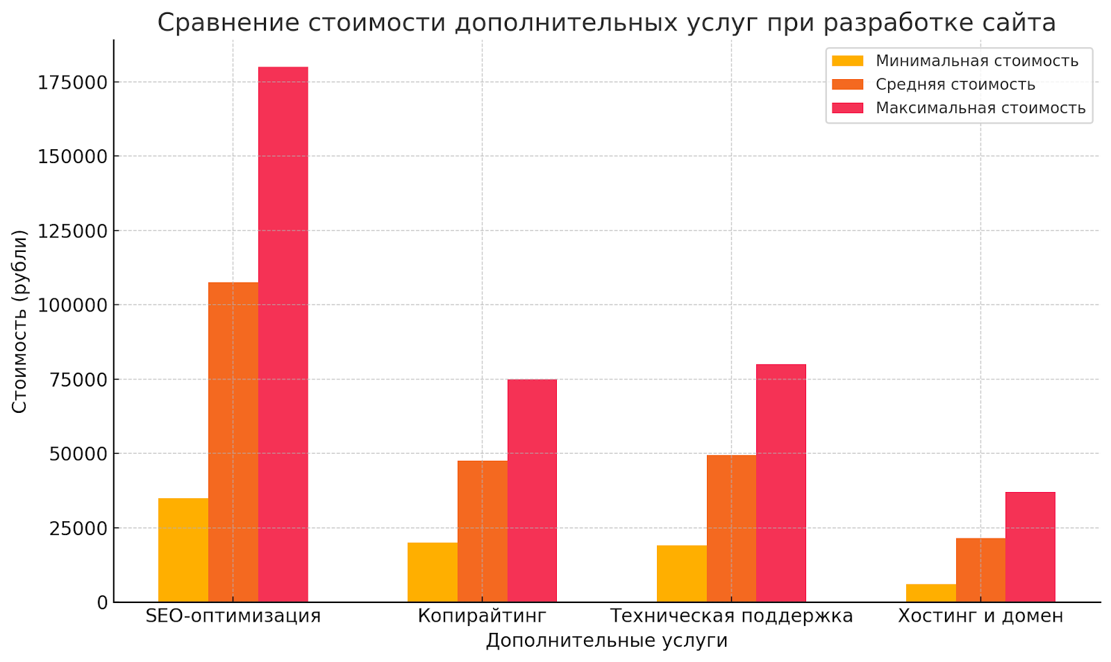 • SEO-оптимизация. Включение SEO в проект может добавить от ₽35 000 до ₽180 000 к стоимости в зависимости от уровня проработки.